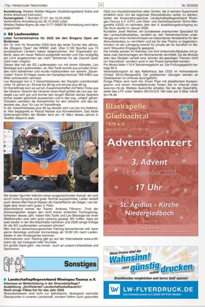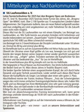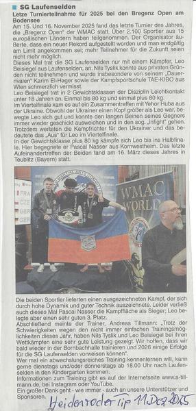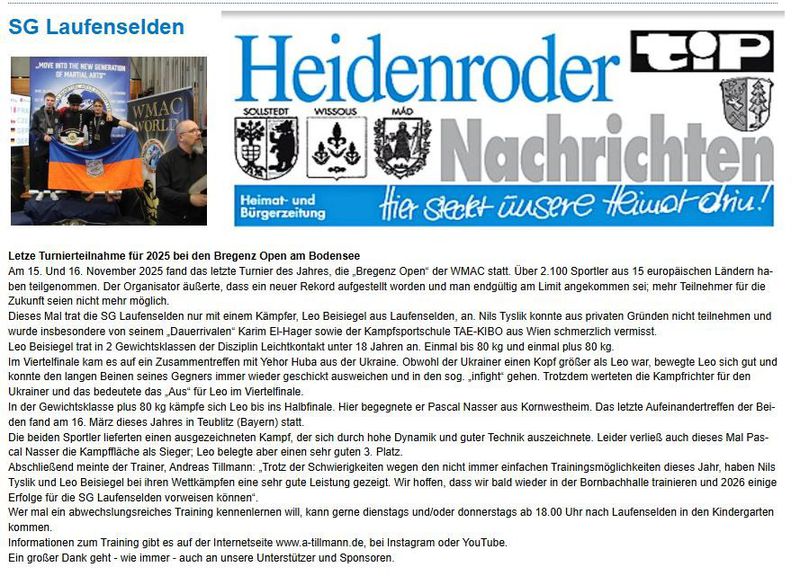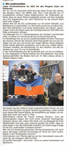 Abschließend meinte der Trainer, Andreas Tillmann: „Trotz der Schwierigkeiten wegen den nicht immer einfachen Trainingsmöglichkeiten dieses Jahr, haben Nils Tyslik und Leo Beisiegel bei ihren Wettkämpfen eine sehr gute Leistung gezeigt. Wir hoffen, dass wir bald wieder in der Bornbachhalle trainieren und 2026 einige Erfolge für die SG Laufenselden vorweisen können“.